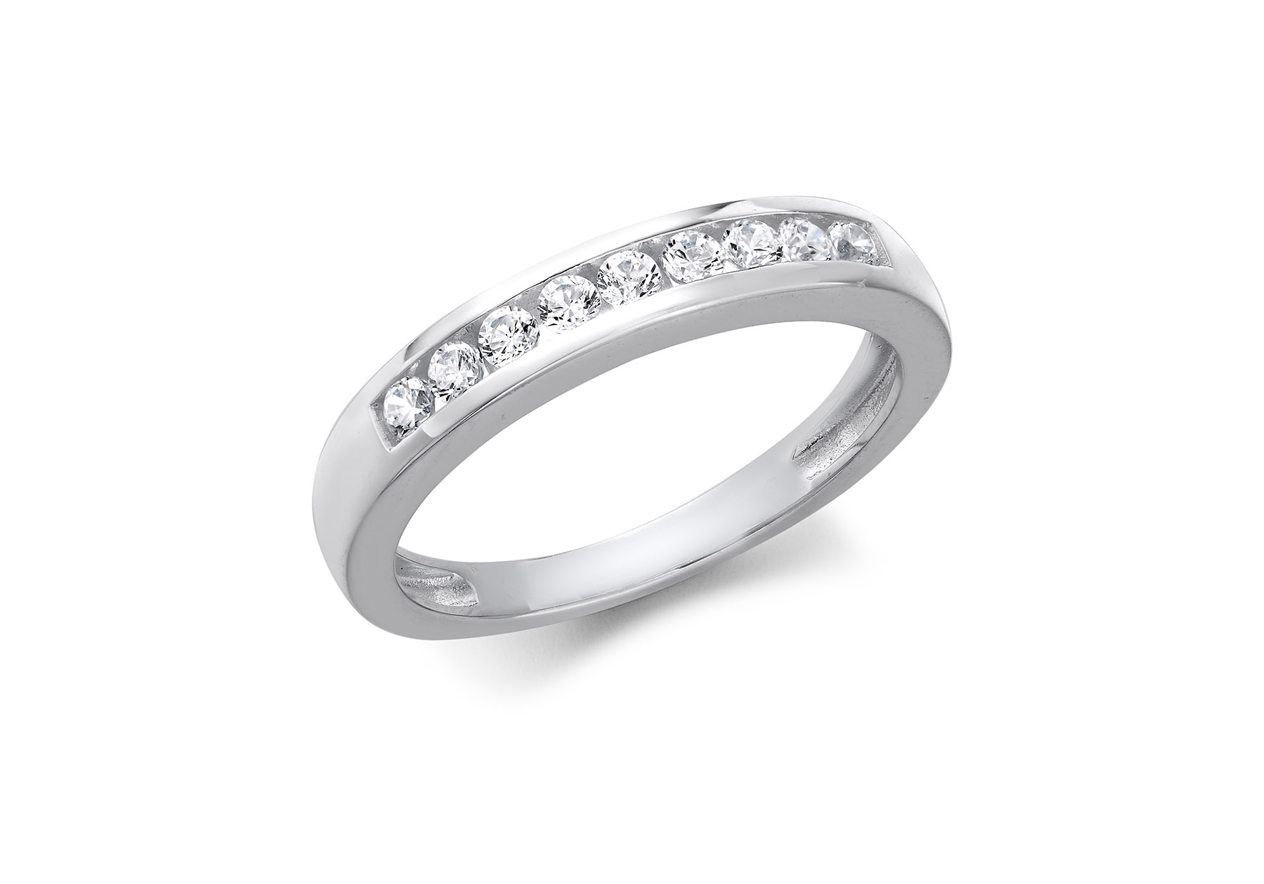 A pretty ring crafted from 9ct white gold and set with sparkling cubic zirconia stones in a channel setting. Treat yourself or a loved one to a ring they will treasure forever!