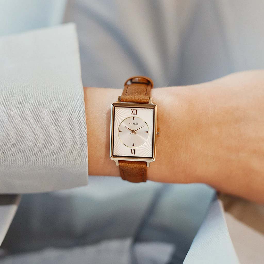 This stunning Amalys Mathilda watch features a rectangular white gold plated dial with a round mini dial in the center, complimented by a brown leather strap. Simple yet sophisticated, Mathilda is the touch of light for any occasion that won’t go unnoticed.