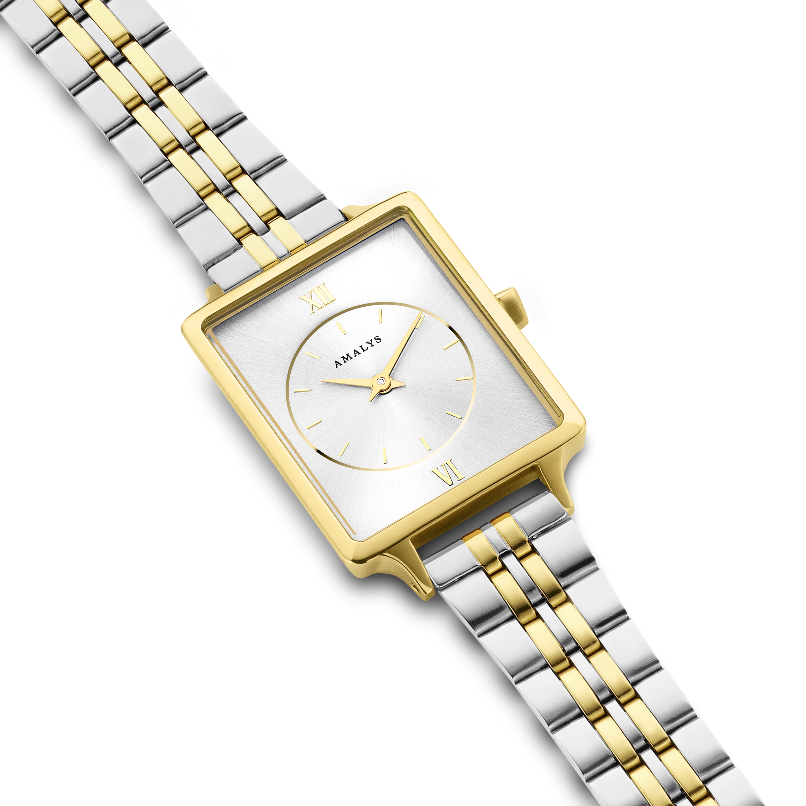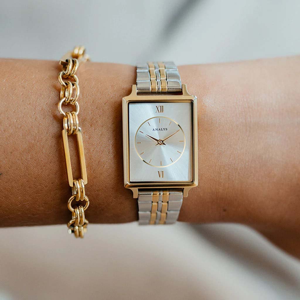 This stunning Amalys Penny watch features a rectangular white dial with a round mini dial in the center, complimented by a two tone bracelet. A mix of gold and silver, Penny stands out for its originality and personality. A trendy combination of two colors.