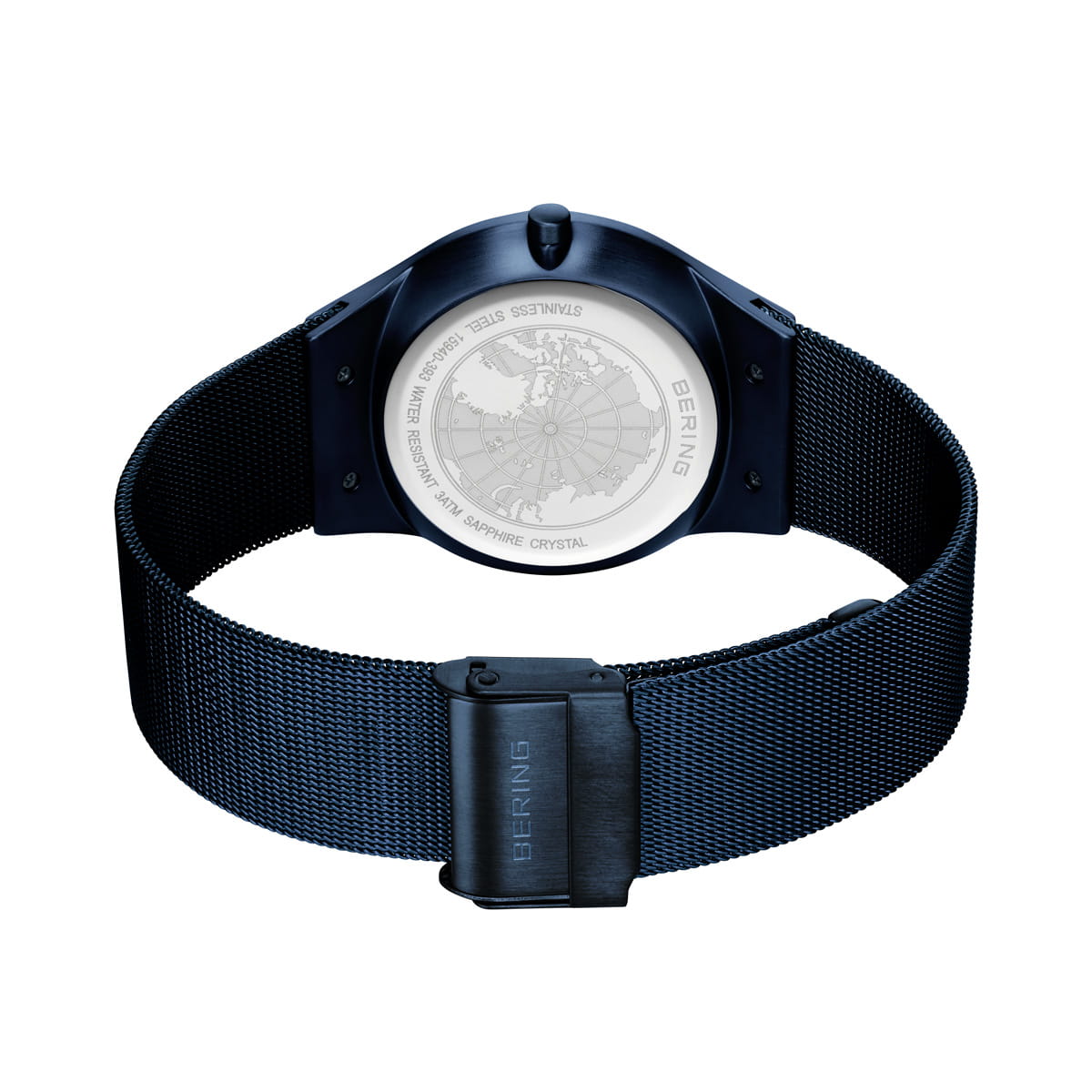The BERING 15940-393 unites minimalist design with striking colour intensity. Inspired by the clarity of the Arctic, it showcases a deep blue sunray dial that shimmers subtly with every change of light – like the sea under the northern lights.