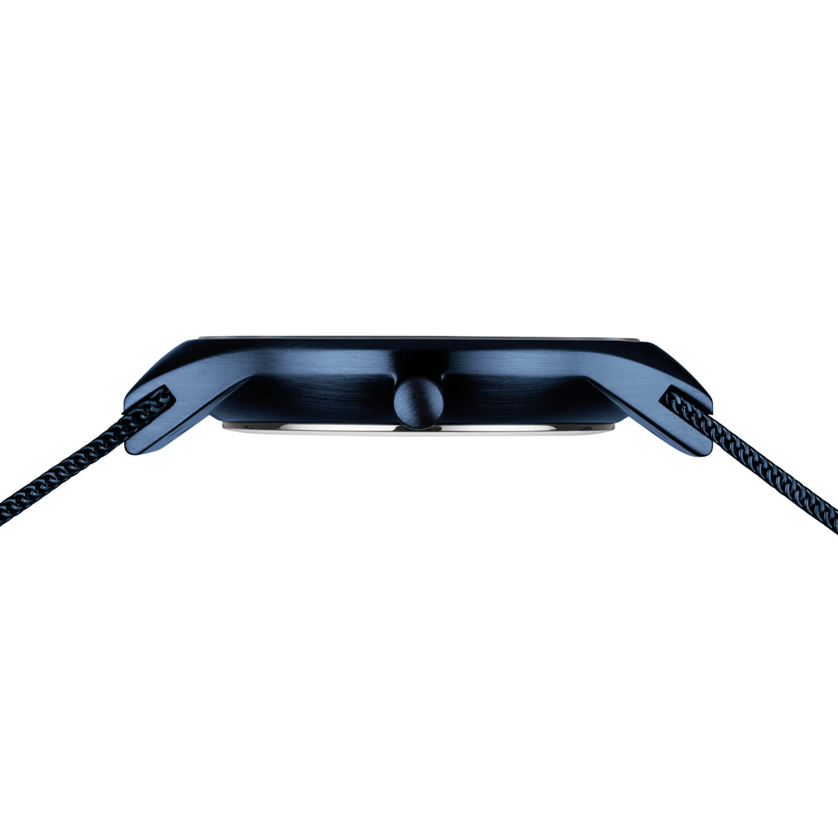 The brushed stainless steel case in vivid blue flows seamlessly into a fine Milanese mesh bracelet, which hugs the wrist comfortably and secures with a reliable folding clasp. Slim, silver-toned hands and clear hour markers emphasise the purist character, while the fine red seconds hand adds a dynamic accent. A discreet date window at three o’clock completes the functional design.