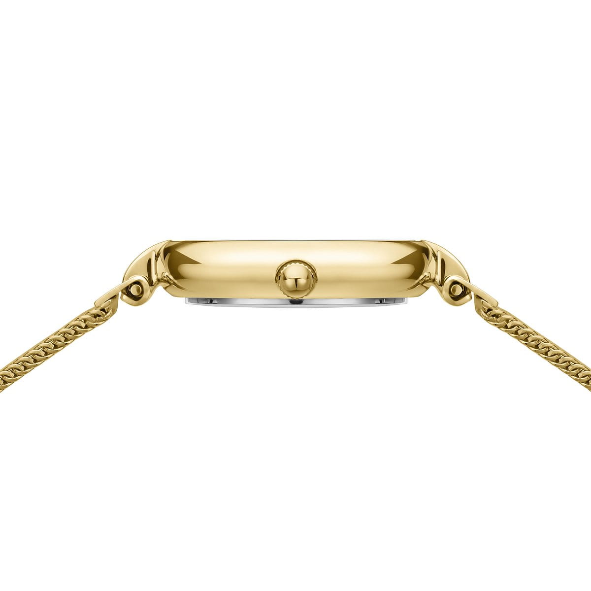 A Milanese strap in warm gold completes the minimalist design with fine texture and exceptional comfort. It wraps smoothly around the wrist and secures with an elegant folding clasp. Flat, scratch-resistant sapphire crystal protects the dial – keeping your view clear, even in everyday life.