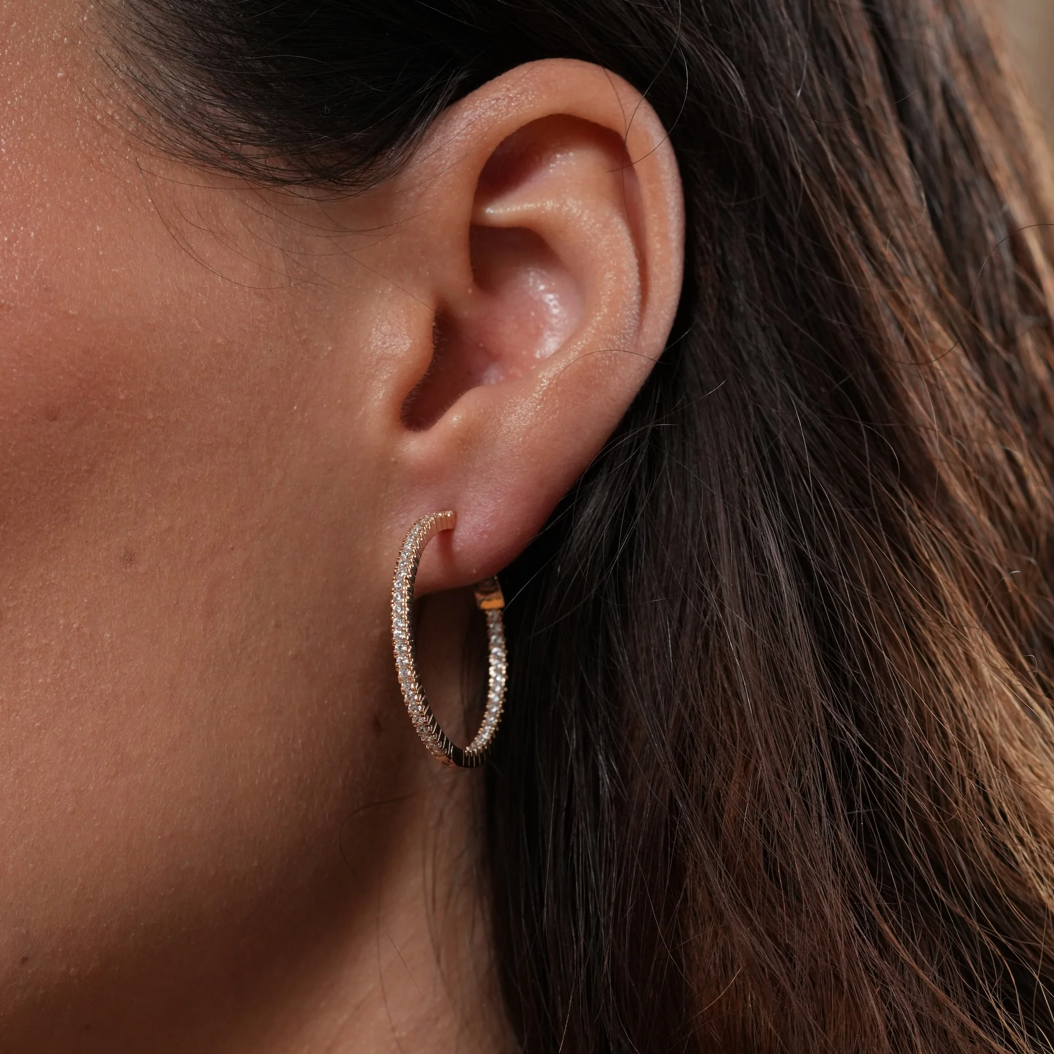 The Madonna Earrings shine brilliantly with 18k gold plating and sparkling cubic zirconia, creating a stunning hoop design that captures attention. These earrings are crafted to be the star of the show, adding a luxurious and radiant touch to your look for any occasion.