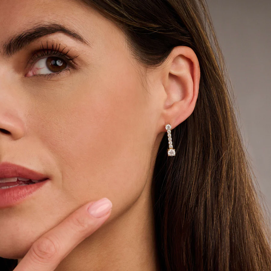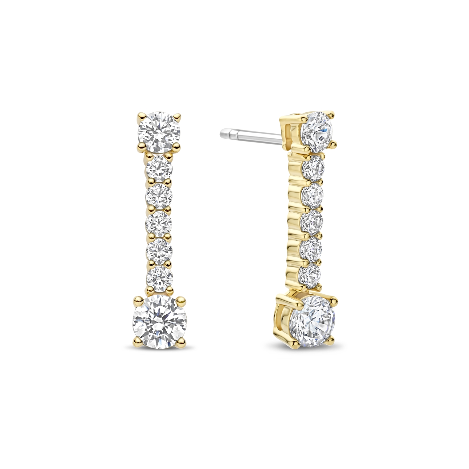 These Long Zirconia Earrings are crafted from high-quality 925 sterling silver and finished with an 18k gold-plated coating. Designed as elegant stud earrings, they feature a larger zirconia stone at the top, followed by a row of smaller brilliant-cut zirconia stones, and another larger zirconia at the bottom. The warm gold tone enhances the sparkling effect and creates rich light reflection with every movement.