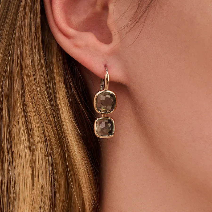 The combination of soft green tones with the warm rose gold finish results in a modern and elegant look. The vertical silhouette allows the earrings to fall beautifully along the jawline, moving subtly with you and enhancing their refined presence. These cushion earrings are perfect worn solo as a stylish eyecatcher, yet they also combine effortlessly with other rose gold-tone or silver jewellery, suitable for both everyday styling and summery looks. 78055GR Cushion & Rectangular earrings