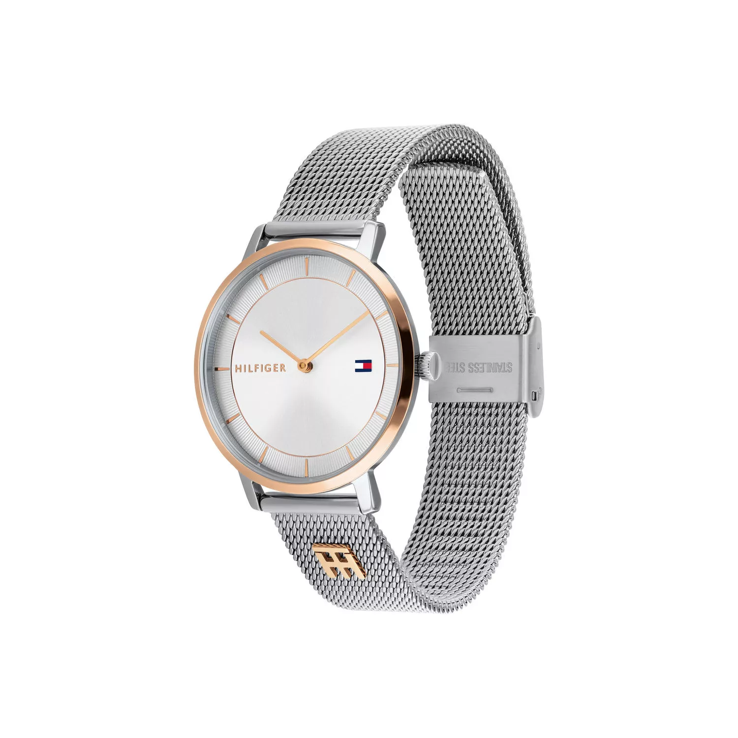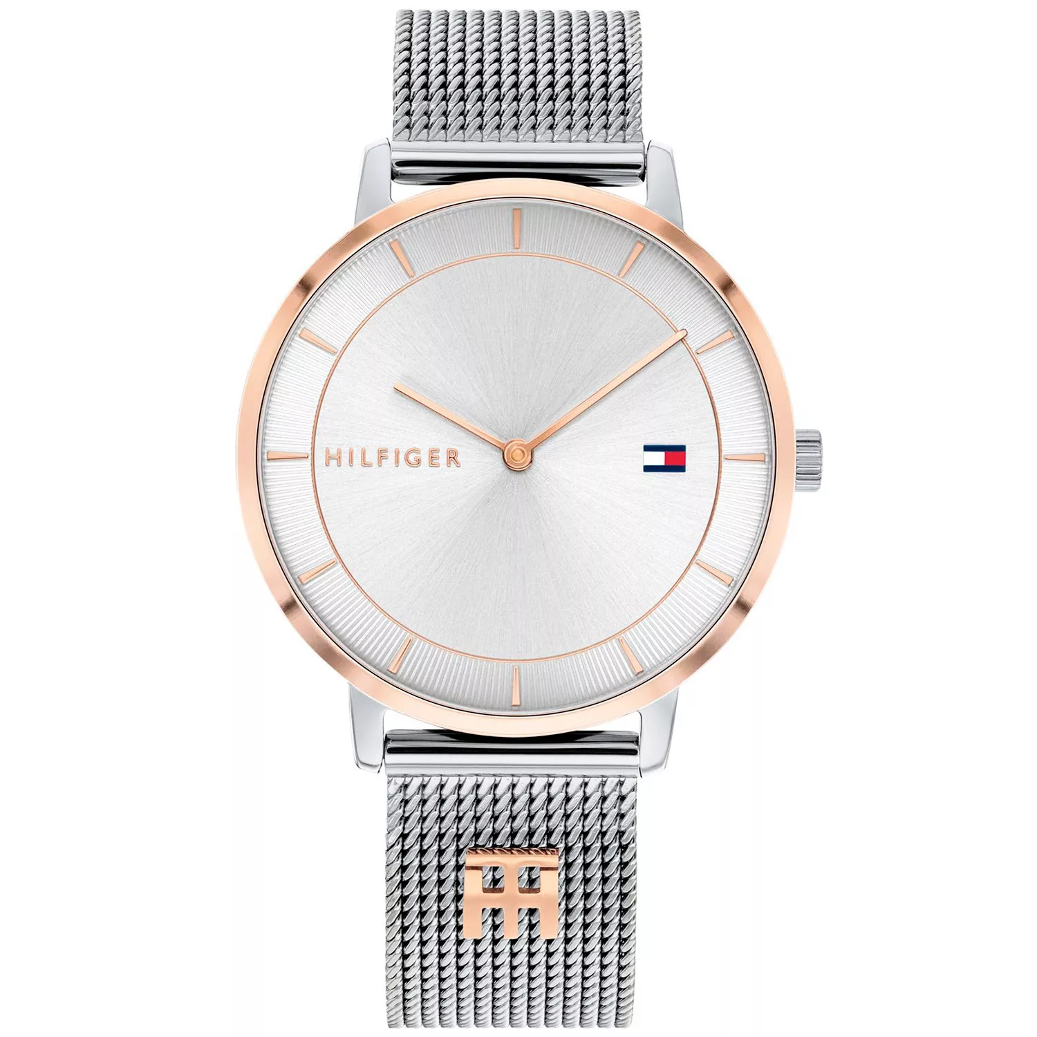 This Tommy Hilfiger timepiece from the Tea collection features a round case that complements its minimalistic dial, adorned with simple hour markers and two sleek hands. The mesh band adds a touch of texture, offering a modern look. A small logo detail on the dial adds a subtle brand touch, while the matching clasp on the band provides a cohesive finish. Featuring a 35 mm diameter, this watch makes a subtle statement on the wrist. It comes with a silver color scheme with rose toned details, including on the dial, case, bezel, and strap.
